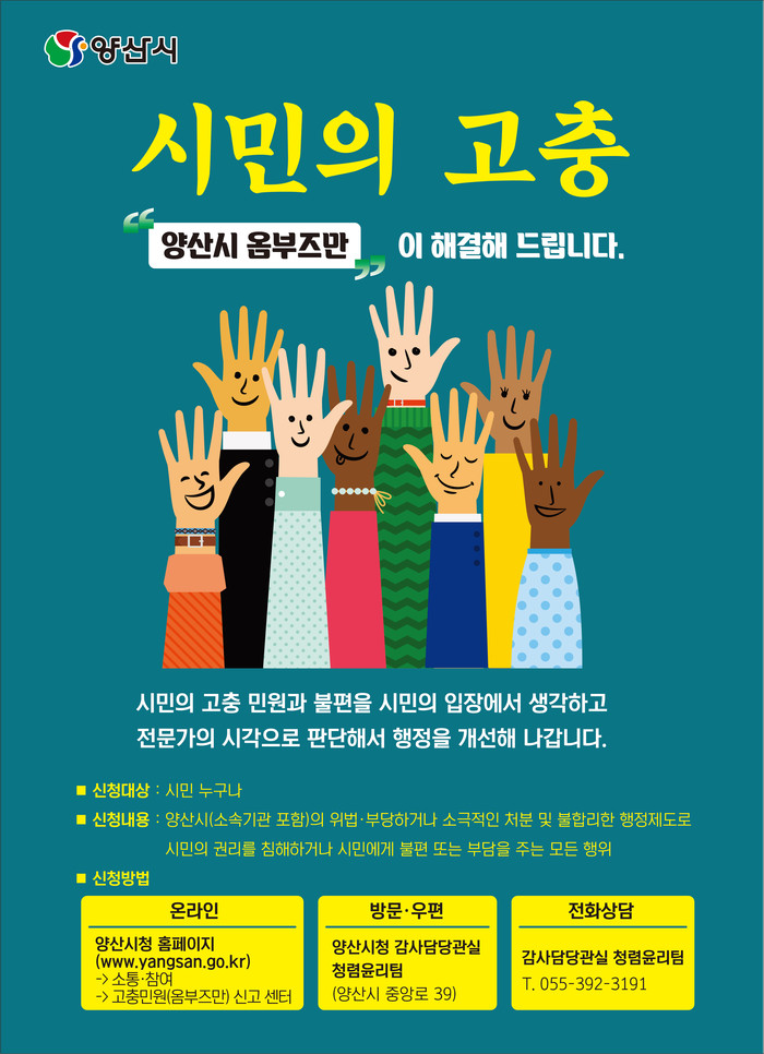 민원 신청방법은 양산시 홈페이지(소통ㆍ참여-고충민원 옴부즈만 신고센터), 직접 방문(양산시청 감사담당관실 청렴윤리팀), 우편, 팩스(055-392-2109)로 신청하면 된다.