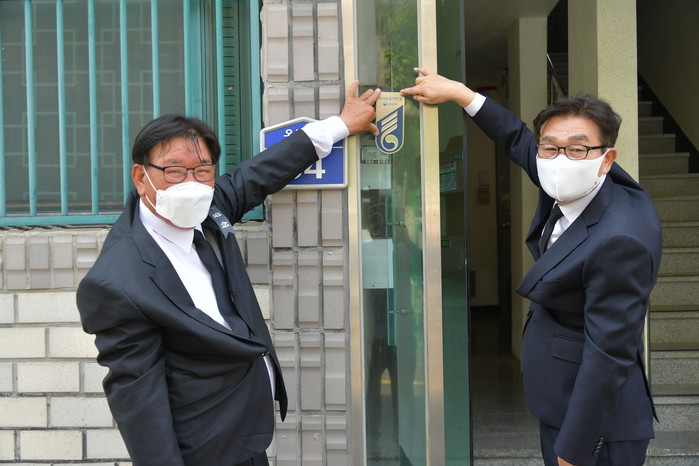 | ▲ 유공자집에명패를달아주는김일권양산시장 |