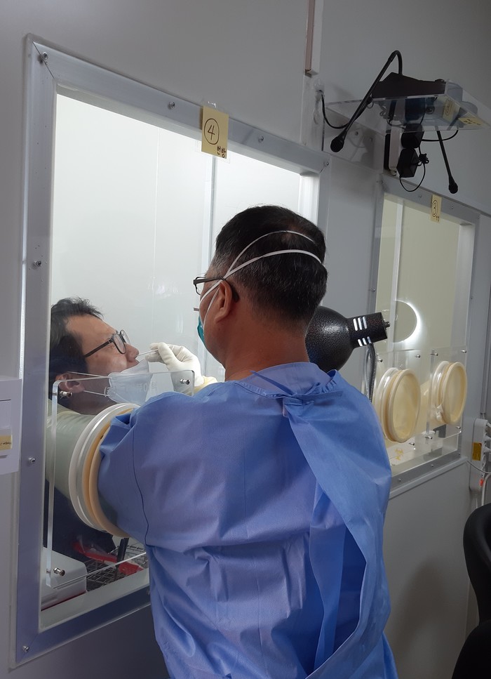 중앙에 아크릴 벽을 두어 의료진과 검사대상자의 공간을 분리하고 장갑이 달린 구멍을 통해 검체를 채취하도록 만든 '의료용 분리벽', 일명 '글로브월'은 의료진이 맞은편 검사대상자와 직접 접촉할 필요가 없다.
