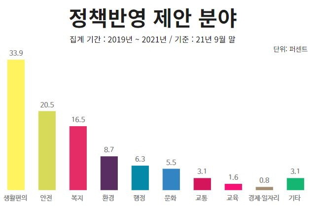 분야별로는 ▲생활편의 33.9% ▲안전 20.5% ▲복지 16.5% 순으로 많았으며, ▲기타 분야에는 인권, 건강증진, 반려동물 관련 제안이 포함됐다.