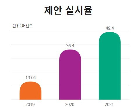 그 결과 지난달 기준 2021년 고양시 제안실시율은 49.4%를 달성, 지난해에 비해 약 10% 향상됐다고 밝혔다.