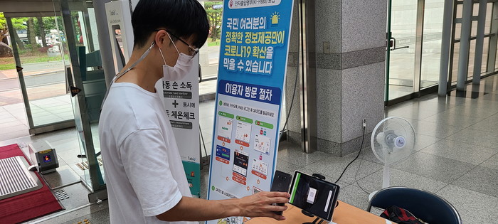 전자출입명부시스템 도입에 따라 진주시청 방문객은 스마트폰을 통해 개인 QR코드를 발급받아 전자출입명부 단말기에 스캔해야 출입을 할 수 있게 됐다.