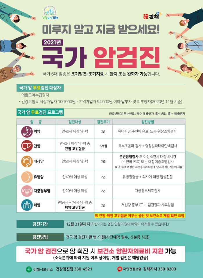 이종학 김해시보건소장은 “작년처럼 코로나19의 확산세가 꺾이지 않고 산발적인 감염병의 발생으로 인해 검진 수검률이 많이 낮아진 상태이며, 그로 인해 감염병 본연의 피해 외의 시민 건강이 우려된다. 국가 암 검진을 통해 암의 조기발견, 조기치료가 가능하니 검진 대상자는 꼭 시간 내어 수검하길 바란다.”고 말했다.