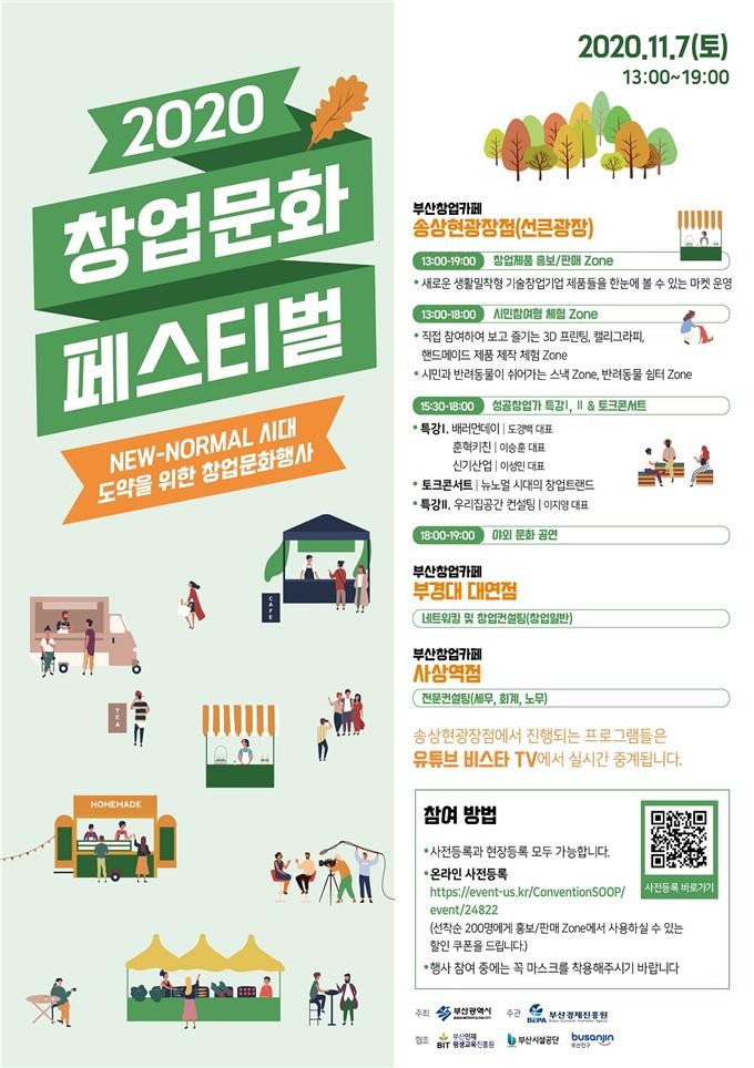부산시(시장 권한대행 변성완)는 부산창업카페 도약의 신호탄인 ‘2020 부산 창업문화 페스티벌’을 11월 7일 오후 1시부터 6시까지 창업카페 3곳에서 동시에 개최한다고 밝혔다.