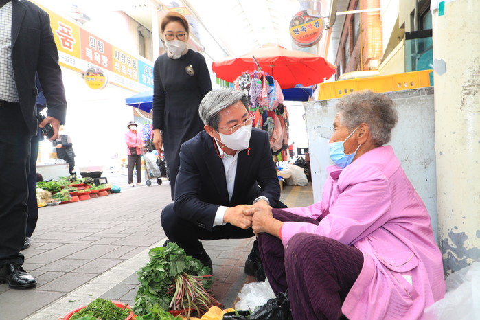 | ▲ 오태완 신임 군수가 전통 시장을 방문해 상인과 인사를 나누고 있는 모습. (사진제공=의령군청) |