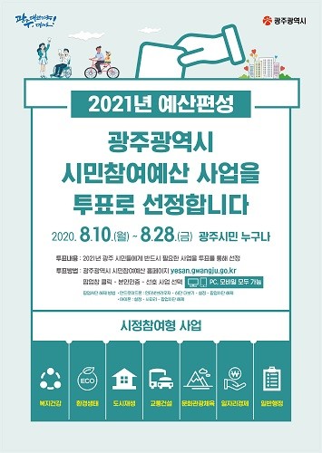 광주시는 2021년도 시민참여예산사업 중 시정참여형사업을 시민 온라인 투표로 선정한다고 9일 밝혔다.