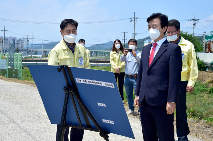 조규일 진주시장은 지난 28일 낮 12시 50분 장재동, 집현면 장흥리 일원에 추진 중인 『장재.장흥 자연재해위험지구 정비사업』현장을 방문해 사업 전반에 대한 추진상황 및 계획을 점검했다.