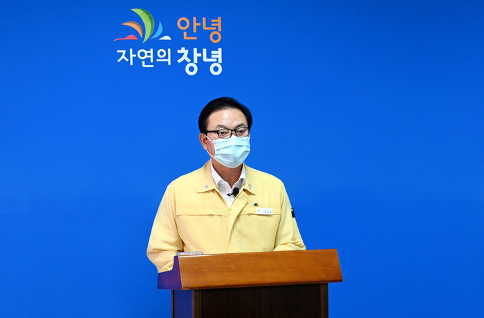 한정우 창녕군수는 31일 군청 브리핑룸에서 코로나19 확산 방지를 위해‘자기주도형 방역 태세 전환을 위한 호소문’을 발표했다.