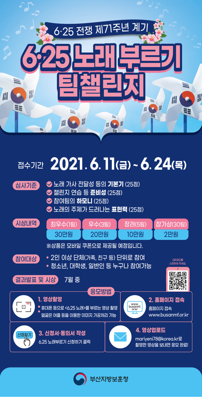 지난 ‘삼일절 노래’, ‘현충일 노래’ 부르기 챌린지에 이어 6·25전쟁 제71주년 계기 ‘6·25 노래 부르기 팀 챌린지’ 이벤트를 오는 6월 11일(금)부터 6월 24일(목)까지 진행하며, 청소년, 대학생, 일반인 등 2인 이상의 단체는 누구나 참여 가능하다.