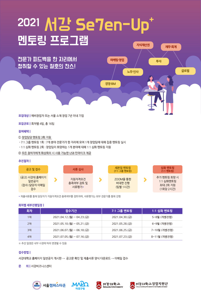 서강대학교(총장 심종혁)가 7개 부문의 전문가로 자문단을 구성해 지역사회와의 연계를 통하여 마포구 관내 및 서울지역 창업기업과 예비창업자를 대상으로 창업 멘토링을 지원하는 ‘2021 서강 세븐업플러스(Se7en-Up+) 멘토링 프로그램’ 2회차의 참가자를 이달 23일까지 모집·접수한다고 밝혔다.