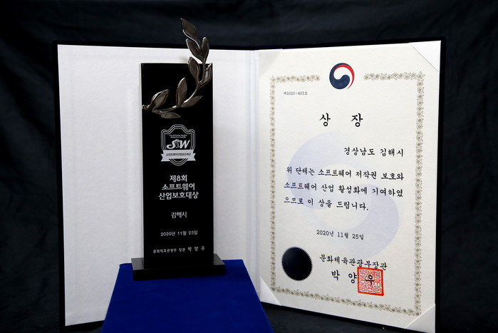 김해시(시장 허성곤)는 제8회 소프트웨어산업보호대상 시상식에서 정품 소프트웨어 이용 환경 촉진 및 소프트웨어 산업 활성화에 기여한 공을 인정받아 문화체육관광부 장관상을 수상하는 영예를 안았다.