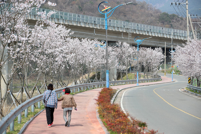 군은 지난 2019년 강변 걷기길 사면에 벚나무를 심어 기존 강변 반대편에 조성돼 있던 벚나무와 더해 벚꽃길을 조성했다.