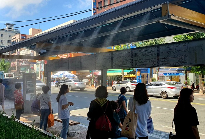 시에 따르면 지난해 여름 유동인구가 많은 시내버스 승강장 4개소(논개시장, 중앙시장, 진주시청, 경상대)에 정수 처리된 물을 인공 안개로 분사하는 쿨링포그 시스템을 시범 설치 운영한 결과 주위 온도를 3~5도 가량 낮추고 이용객의 호응도가 높아 올해에도 3개소를 추가 확대 설치할 계획이다.