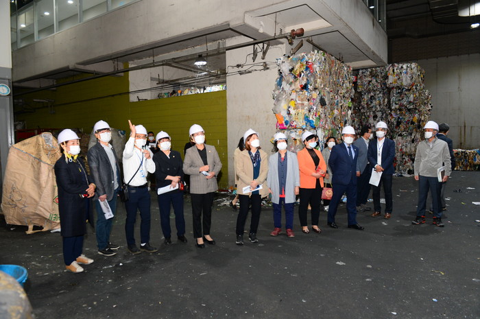| ▲ 중랑구의원들이 중랑 자원재활용 선별센터에서 재활용폐기물 선별에 관한 설명을 듣고 있다.(사진제공=중랑구의회) |
