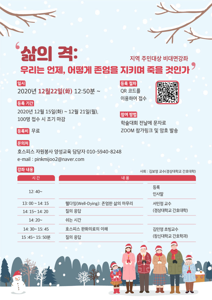 진주시와 경상대학교 간호대학은 오는 22일 진주시민을 대상으로 ‘호스피스·완화의료의 이해’와 ‘웰 다잉(Well-Dying)’을 주제로 비대면 강좌를 실시한다고 15일 밝혔다.