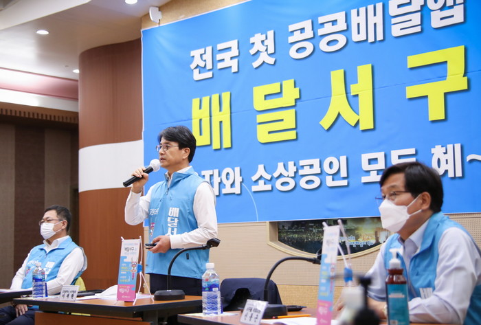 ▲ 서구는 공공배달앱 ‘배달서구’를 본격 출범했다. 사진은 이 구청장(가운데)이 배달서구에 대해 설명을 하고 있는 모습. (사진제공=인천 서구청) |