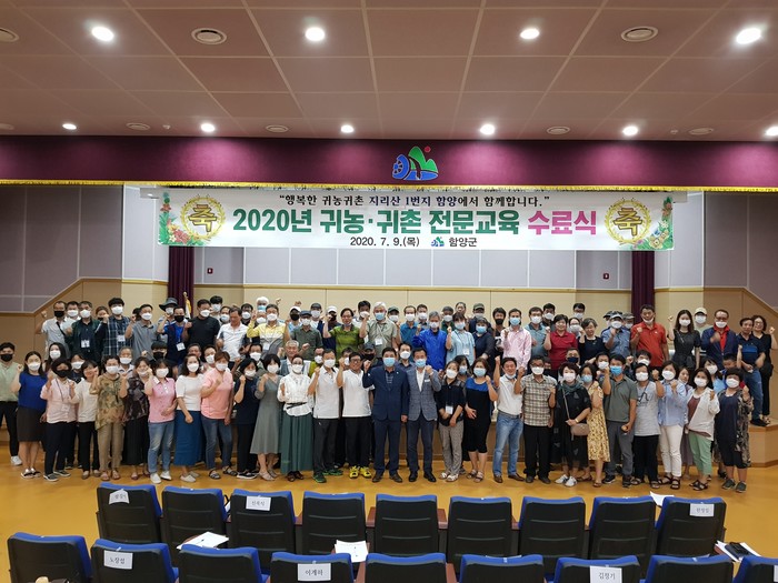 ▲ 지난 7월 열린 '2020 귀농·귀촌 전문교육 수료식'에서 수료생들이 기념촬영을 하는 모습. (사진제공=함양군청) |