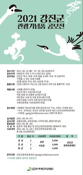 대한민국 국민 누구나 참여할 수 있는 이번 공모전은 강진군 역사·문화·자연 등을 소재로 국내·외 관광객이 구매할 수 있는 관광기념품(단품 3만 원 이내, 세트 10만 원 이내)을 접수한다.