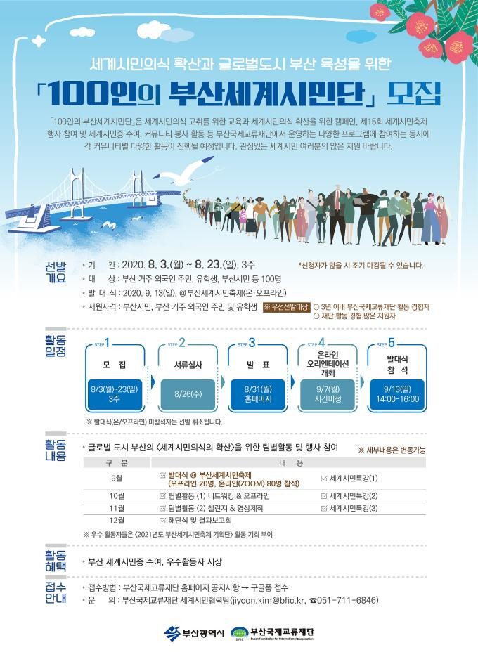 부산시(시장 권한대행 변성완)와 부산국제교류재단은 ‘제15회 부산세계시민축제’를 기념하여, 글로벌도시 부산을 대표하는 「100인의 부산세계시민단」을 모집한다고 밝혔다.