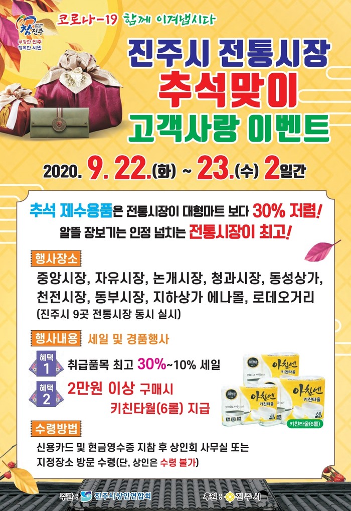 이번 행사를 주관하는 진주시상인연합회 차성수 회장은 “코로나19로 지속되는 경기불황과 최근 경제상황의 변동으로 모두가 어렵고 힘들지만 우리 고유의 명절인 추석을 앞두고 전통시장을 찾아주시는 고객여러분께 감사의 마음을 전하고자 마련한 행사인 만큼 많은 분들이 참여해 주시길 부탁드린다”고 전했다.