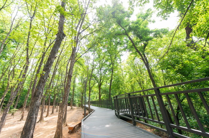 서울 양천구 신정동과 구로구 고척동 일대의 옛 지명인 '부평군 계남면'의 지명을 따서 명명된 계남근린공원(신정동 산44-2일대)의 녹음이 짙어진 대왕 참나무 숲길이 도심의 더위를 식혀주고 있다.