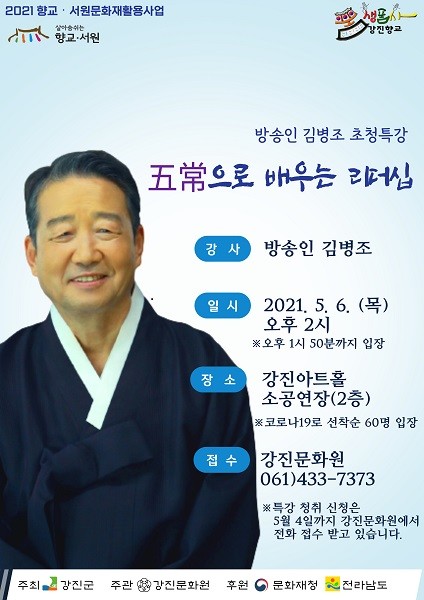 2021년 향교·서원문화재활용사업으로 추진되는 이번 특강은 강진군이 주최하고 강진문화원 주관, 문화재청이 후원한다. 인(仁)·의(義)·예(禮)·지(智)·신(信)‘오상(五常)으로 배우는 리더십’이란 주제로 현대인에게 필요한 리더십의 덕목을 알아본다.