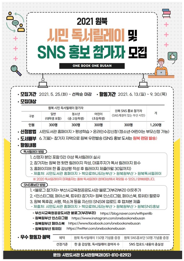 시민도서관은 원북 SNS 홍보 참가자도 300명을 모집한다. SNS계정이 있는 부산시민이면 누구나 참여 가능하다.