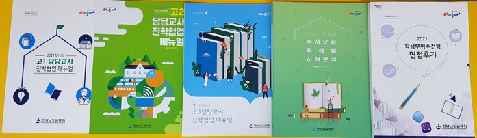 경남교육청 대입정보센터에서 제작한 자료는 ‘고1담당교사진학협업매뉴얼’ ‘고2담당교사진학협업매뉴얼’ ‘고3담당교사진학협업매뉴얼’ ‘학생부위주전형 면접후기’ ‘수시모집학생별지원분석’ 등 책자 5종이다.