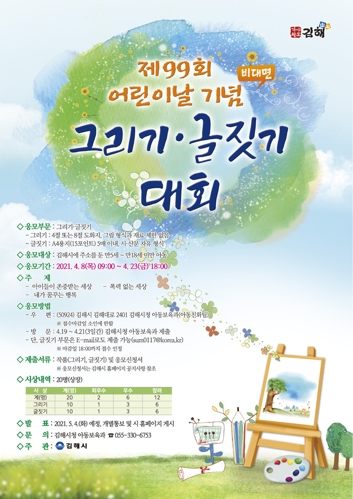 작품은 응모신청서와 함께 오는 23일까지 김해시청 아동보육과로 우편 및 방문 제출하면 되고, 방문제출은 19일부터 21일까지 3일간 가능하다. 또한 글짓기의 경우 마감일 18시까지 e-mail 제출도 가능하다.