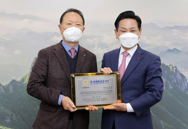 | ▲ 전동평 영암군수(우측), 한국평화언론인 대상 수상 기념촬영 / 영암군 제공 |