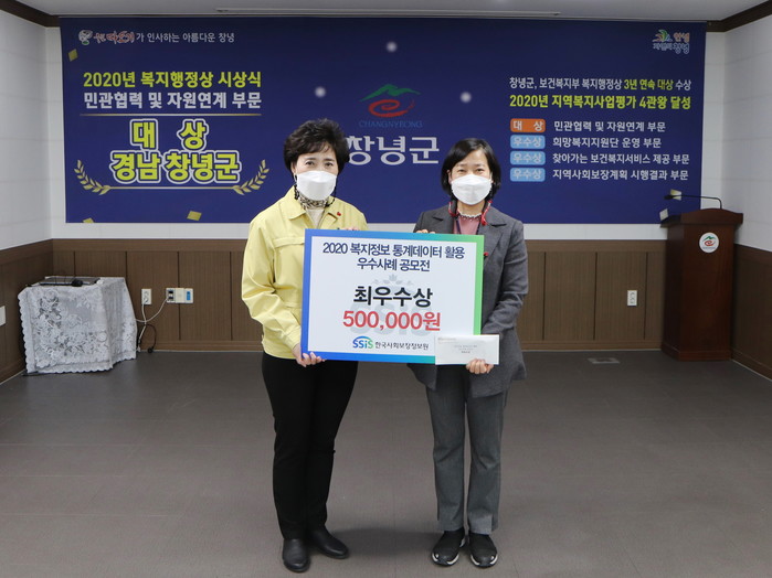 창녕군(군수 한정우)은 한국사회보장정보원이 주관한 복지정보통계시스템 ‘통계데이터 활용 우수사례 공모전’에서 주민복지과 조숙희(사회복지 7급, 45세) 주무관이 최우수상을 수상했다고 밝혔다.