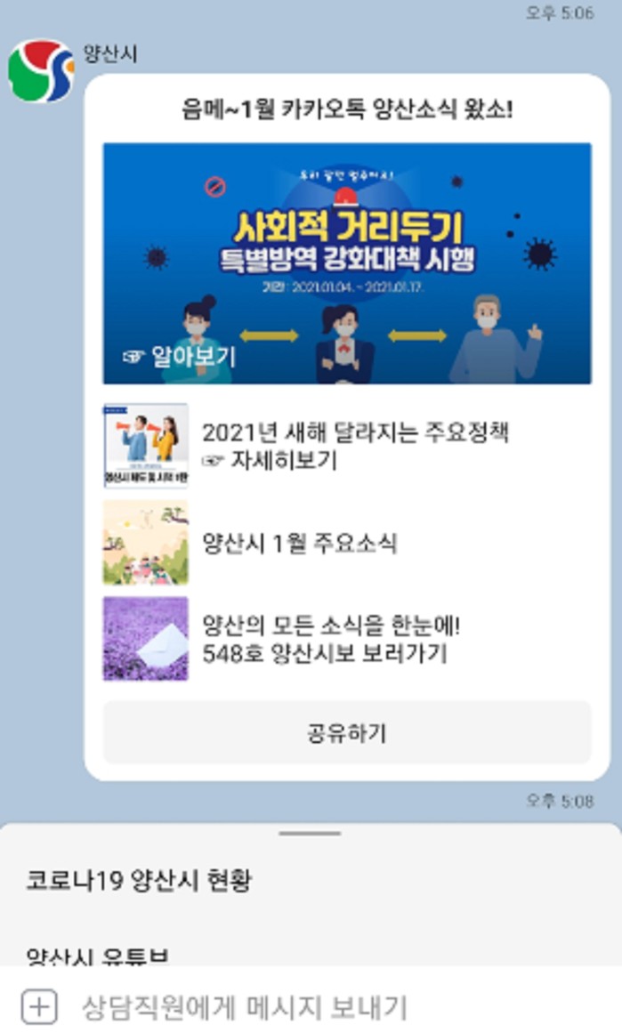 양산시는 다양한 시정소식을 시민들이 좀 더 편리하게 받아볼 수 있도록 올해 1월부터 카카오톡을 통해 시정소식을 제공한다