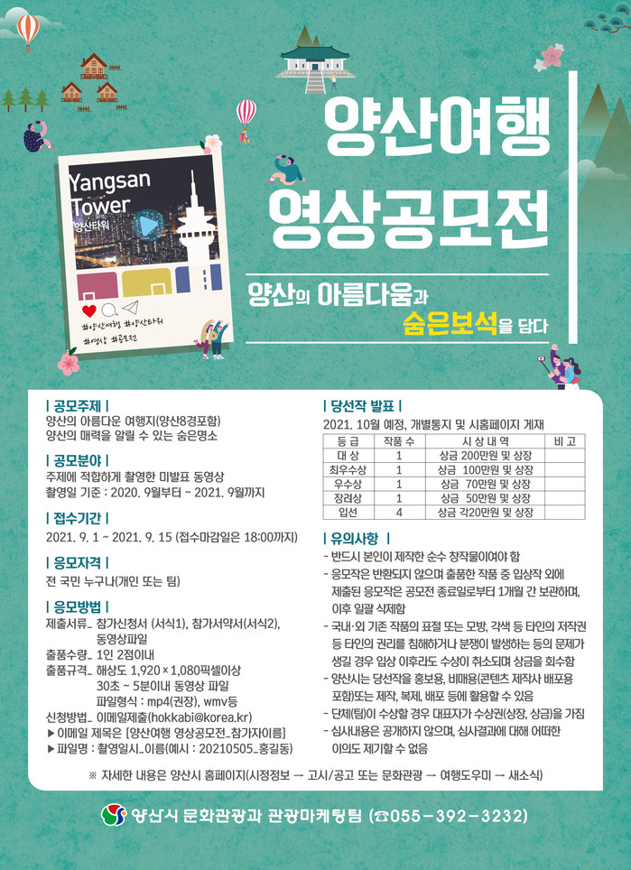 ‘양산의 아름다움과 숨은 보석을 담다’라는 주제로 개최하는 이번 공모전은 양산8경과 같은 유명 관광지의 아름다운 모습이나, 숨겨진 보석같은 장소를 발굴하여 30초~5분이내의 영상을 담은 작품을 대상으로 하고 있다.