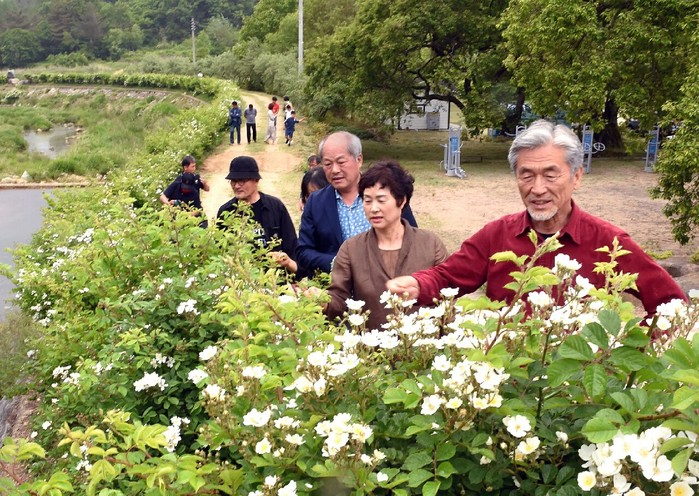 산청군은 당시 장사익씨와의 인연을 계기로 차황면 금포숲에서 차황면 소재지까지 야생초 둑방길 1km 구간에 찔레꽃을 심었다.