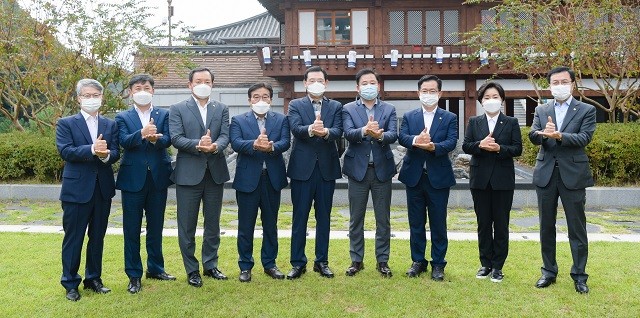 | ▲ 이용섭 광주광역시장이 3일 오후 동구 전통문화관에서 열린 광주광역시-지역 국회의원들과의 현안간담회에 참석해 기념촬영을 하고 있다. 왼쪽부터 더불어민주당 민형배·조오섭·이형석·이병훈 의원, 이용섭 광주광역시장, 더불어민주당 송갑석 광주시당위원장, 더불어민주당 이용빈 의원, 더불어민주당 양향자 최고위원, 더불어민주당 윤영덕 의원./광주광역시 제공 |