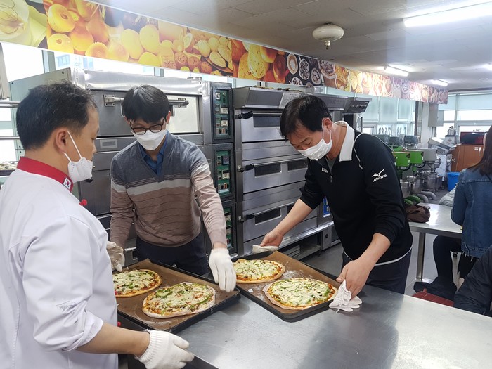 | ▲ 공사 직원들이 피자를 만들고 있는 모습. (사진제공=김해시청) |