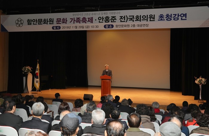 내빈 축사에 이어 2부 초청 강연에서는 함안출신 안홍준 前 국회의원이 ‘대한민국의 위상과 미래’라는 주제로 강연을 했다.