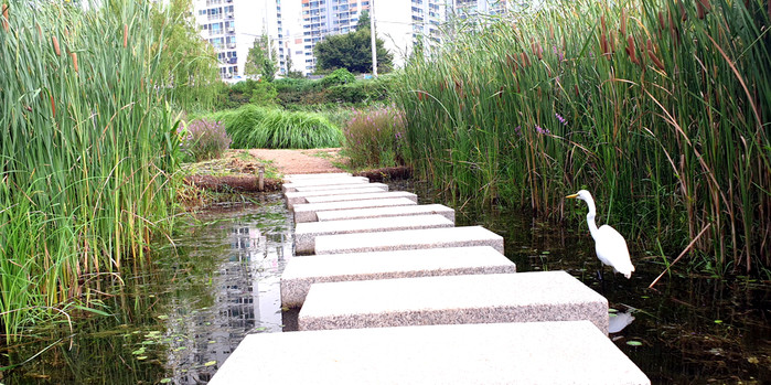 | ▲ 개봉유수지 생태공원의 한 돌다리 근처를 걷고 있는 백로.(사진제공=구로구청) |