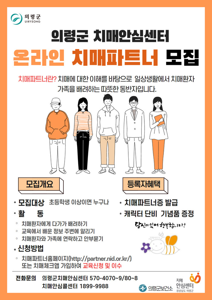 의령군(군수 권한대행 백삼종)은 치매 친화적 환경조성 위해 치매파트너를 온라인을 통해 비 대면으로 모집한다.
