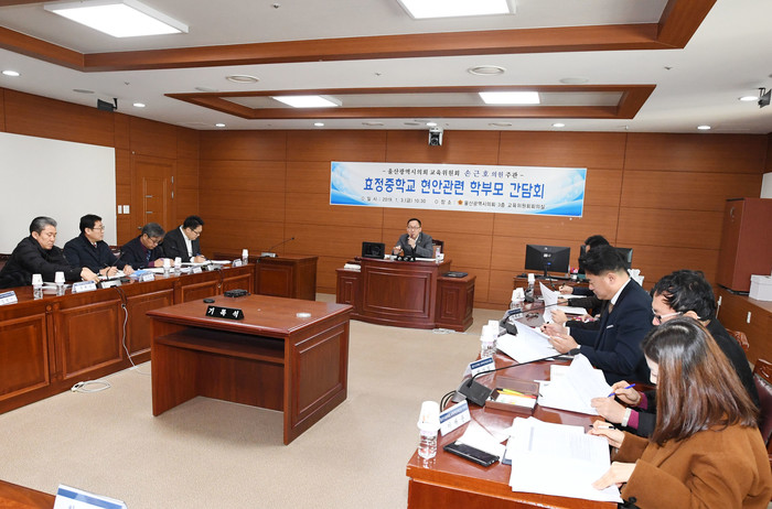 간담회를 주관한 손근호 의원은 “울산 율동 공동주택지구 계획부지 인근에 위치한 효정중학교 학생들이 주택지구 공사로 인해 발생되는 소음과 분진, 안전문제 등 여러 문제점들로 인해 정상적인 학교생활에 어려움을 겪고 있다는 학부모님들의 다양한 민원사항이 있어 오늘 이와 관련된 여러 현안들과 의견들을 논의 해 해결 방안을 모색하고자 이 자리를 마련했다.”며 간담회를 시작했다.