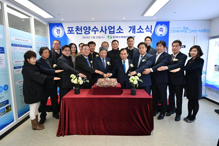 | ‘포천양수사업소 개소식’에서 박윤국 시장과 관계자들이 기념촬영을 하고 있다.(사진제공=포천시청) |
