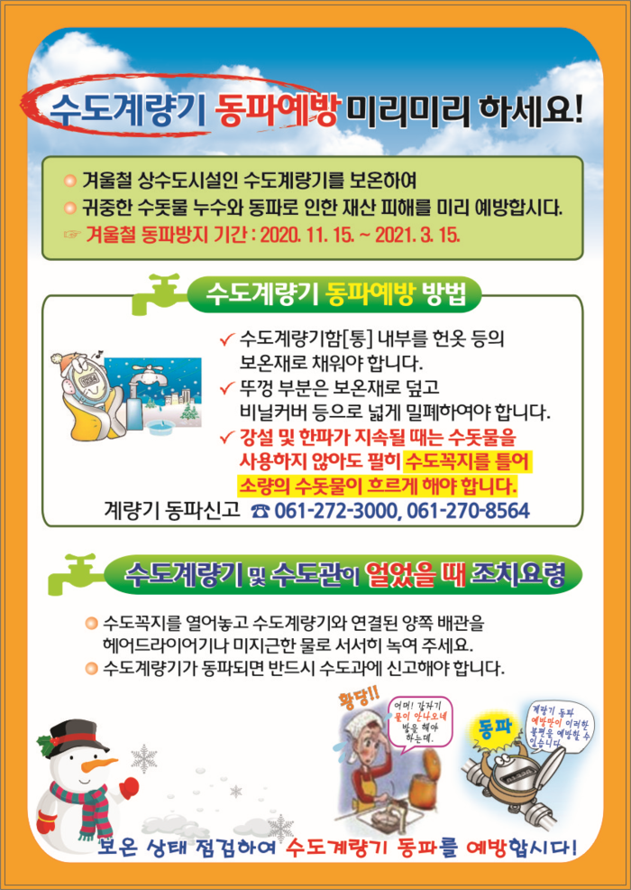 시 관계자는 “지난 15일부터 2021년 3월 15일까지 ‘24시간 동파민원처리 상황실(☎272-3000, 270-8564)’운영하고 있다. 동파 관련 민원발생 시 신속한 대처를 통해 겨울철에도 깨끗한 수돗물을 안정적으로 공급할 계획이다”고 밝혔다.