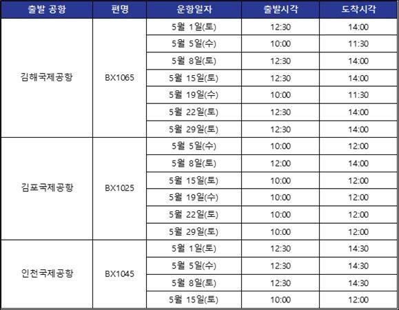 에어부산은 김해공항에서 1일 첫 운항을 시작해 5월 한 달간 총 7회 운항하며, 김포공항에서는 5월 5일 첫 운항을 시작으로 6회 운항할 계획이다. 기존 운항하던 인천공항에서도 총 4회 운항을 배정받았다. 에어부산은 5월 한 달 동안 총 17회의 무착륙 국제관광비행을 운항한다는 계획이다.