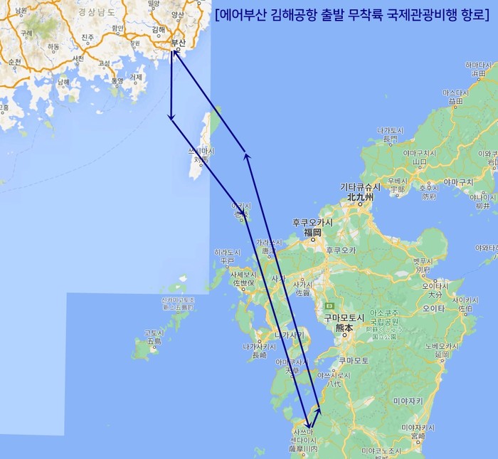 김해공항 출발 무착륙 국제관광비행은 운항 노선도 색다르게 구성된다. 김해공항에서 출발해 대마도→나가사키→사가→가고시마까지 운항 후 김해공항으로 되돌아오는 1시간 30분 여정으로 일본 규슈 서쪽 지역을 상공에서 감상할 수 있는 장점이 있다. 인천 및 김포공항 출발 무착륙 관광비행은 인천(김포)에서 출발해 대구→부산→대마도 상공까지 비행 후 되돌아오는 2시간 여정으로 운항한다.
