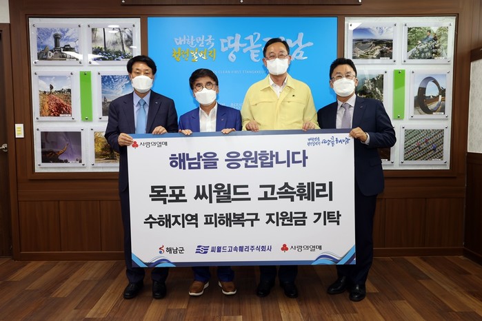 국내 제주기점 항로 1위 연안여객선사 씨월드고속훼리㈜(회장 이혁영)는 전남 서부지역(해남군, 진도군)에 기록적인 집중호우로 막대한 인명과 재산피해가 발생했다는 소식을 접하고, 침수 피해를 입은 수재민의 조속한 일상생활 복귀를 돕고자 지난 7월 14일 해남군청과 진도군청을 방문하여 수재민 구호 성금 2천만원을 전달했다고 밝혔다.