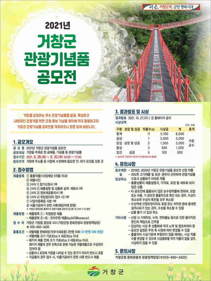 거창군은 9월 28일부터 30일까지 ‘2021년 거창 관광기념품 공모전’을 접수한다.