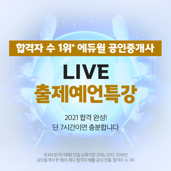 [시민일보 = 여영준 기자] 에듀윌은 올해 공인중개사 시험을 준비하는 수험생을 위해 ‘LIVE 출제예언특강’ 마련했다고 밝혔다.