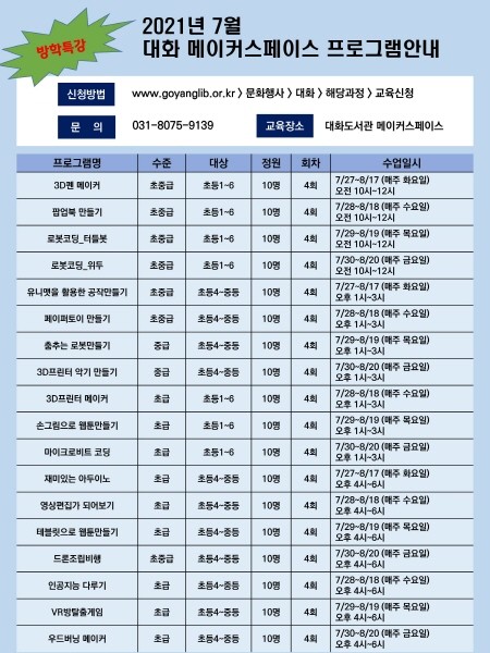 [고양=이기홍 기자] 고양시 대화도서관 메이커스페이스는 여름방학을 맞아 오는 27일부터 방학특강 프로그램을 진행한다.