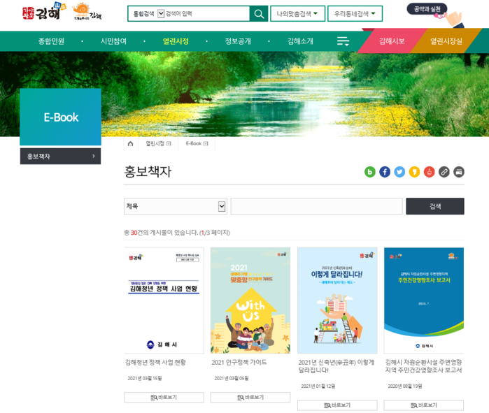 김해청년정책 e북은 시와 일자리지원센터 홈페이지에 있으며 시 홈페이지의 경우 열린시정>e북>홍보책자로 들어가면 되고 일자리지원센터는 홈페이지 팝업존과 배너란에 올려져 있다.