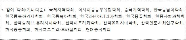 * 참여 학회(가나다순): 국제지역학회, 아시아중동부유럽학회, 중국지역학회, 한국동남아학회, 한국동북아경제학회, 한국동북아학회, 한국라틴아메리카학회, 한국몽골학회, 한중사회과학학회, 한국슬라브·유라시아학회, 한국아프리카학회, 한국유라시아학회, 한국인도사회연구학회, 한국중동학회, 한국포르투갈·브라질학회, 현대중국학회